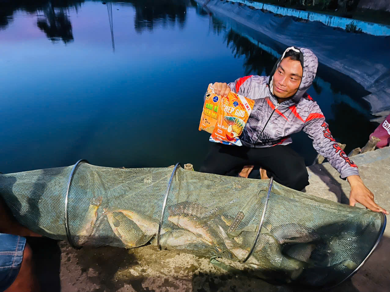 Mồi nhử: Cám nền + hương liệu xả liên tục để giữ cá.