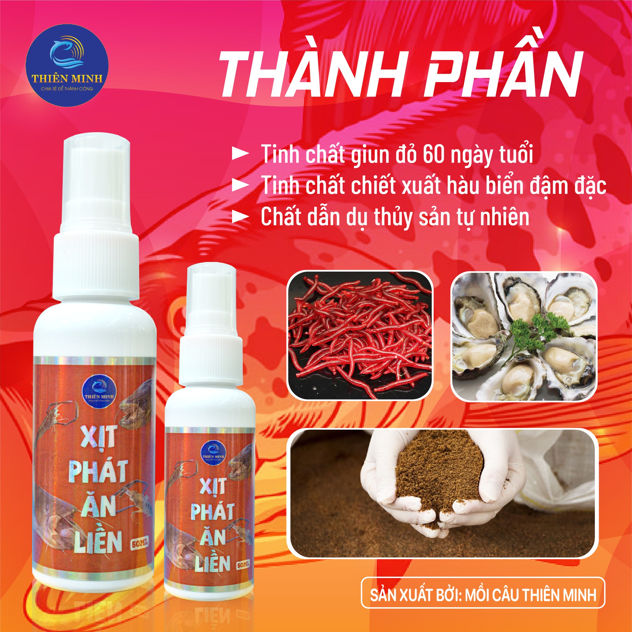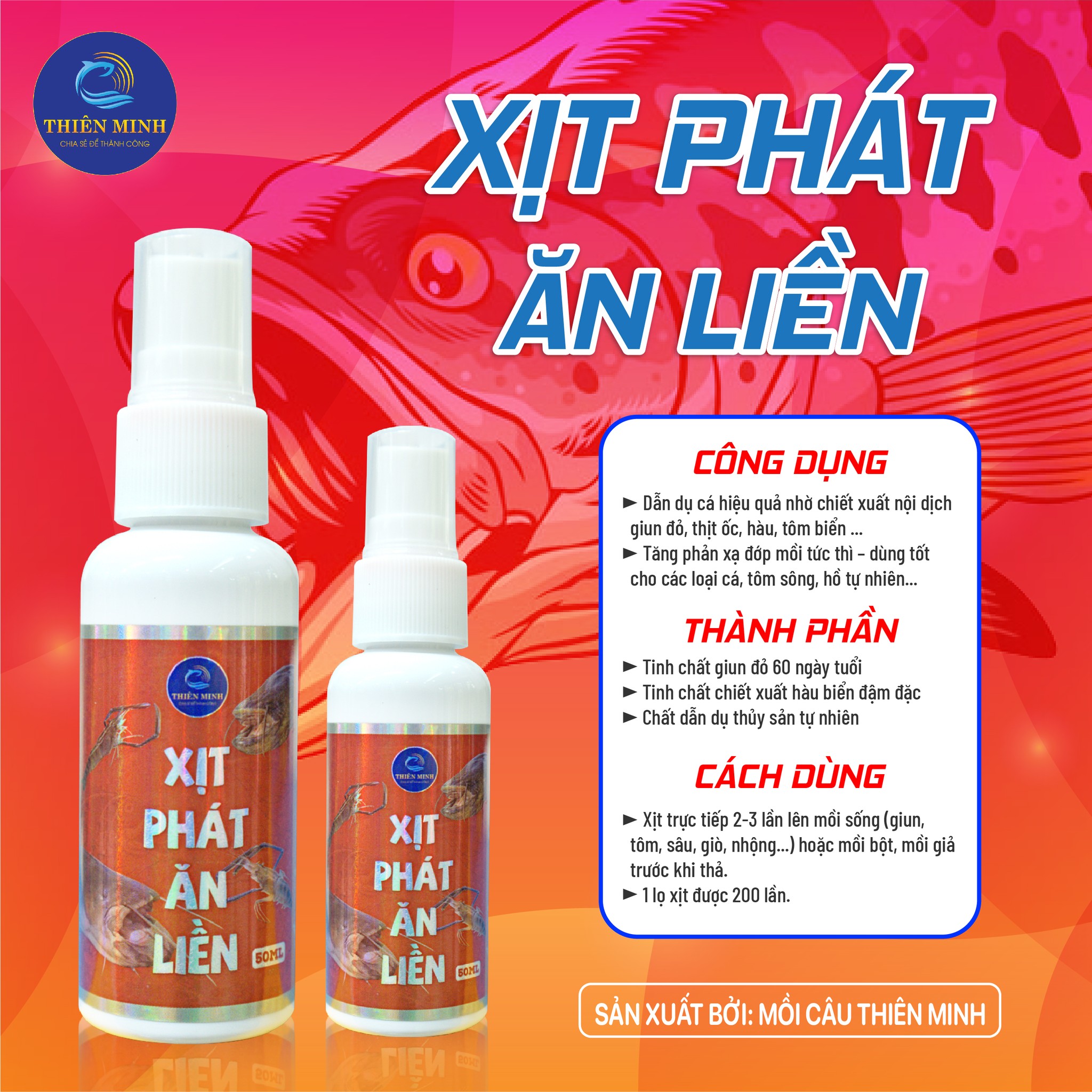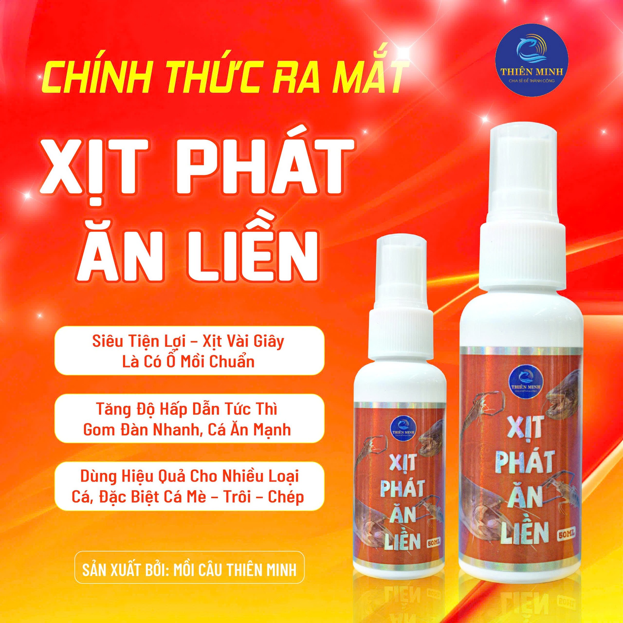 🎯 Xịt Phát Ăn Liền Thiên Minh là sản phẩm dẫn dụ cá thế hệ mới – chỉ cần vài giây xịt, ổ mồi lập tức phát hương mạnh, kích hoạt phản xạ đớp mồi ngay tức thì.